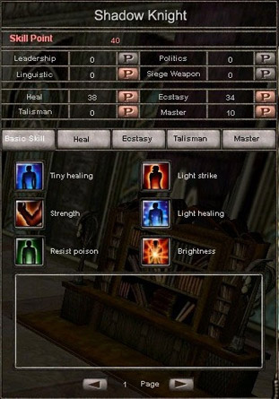 Pressing “K” will bring up your character's skill window. You will earn skill points with every level after level 10 and can distribute them by clicking on the “P” next to the name of the skill you wish to increase. The more points spent on a skill, the more spells and abilities will be available under that skill tree. How you distribute your skill points is entirely up to you but DO NOT put any points into Leadership, Language, Politics, or Siege Weapon as they are not implemented in the game right now. It is further recommended that you choose only two of the three active skill trees to develop so that you can build a more powerful character.