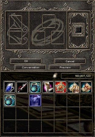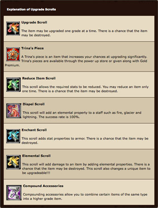 To upgrade an item, place the upgrade scroll into one of the 9 slots in the middle of the upgrade display and then place the weapon or armor you wish to upgrade in the single slot on the left. After both items are in place, click “OK”. Every time you upgrade however, there is a chance that your item will break and be lost forever. There are items such as the “Trina's Piece” that will increase your chances of success. Those items can be purchased from the Power Up Store.