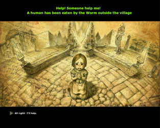 Equip yourself with your starter weapon, and head out of the castle. Look for some nasty big worms, and attack! Defeat the worm and you will have saved the day and gained a loyal and helpful friend (after a little encouragement).