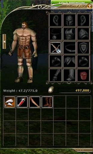 Your character's equipment is very important. A strong suit of armor can turn aside the mightiest blow, and a powerful weapon will allow you to slay enemies quickly and efficiently. You can acquire equipment by purchasing it from a merchant NPC, another player, or by picking up pieces of equipment that drop from monsters you defeat in battle. If you pick up a useable item, you can equip it via your inventory (press "I" to see your inventory). This is done two ways: 1) Right-click the item and it will auto-equip (only if your character meets the requirements for the item, which can be seen by moving the cursor over the item). 2) By clicking on the item and holding the left mouse button on it while dragging it to the desired slot.